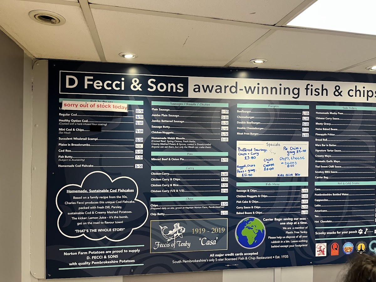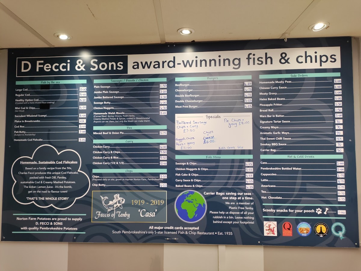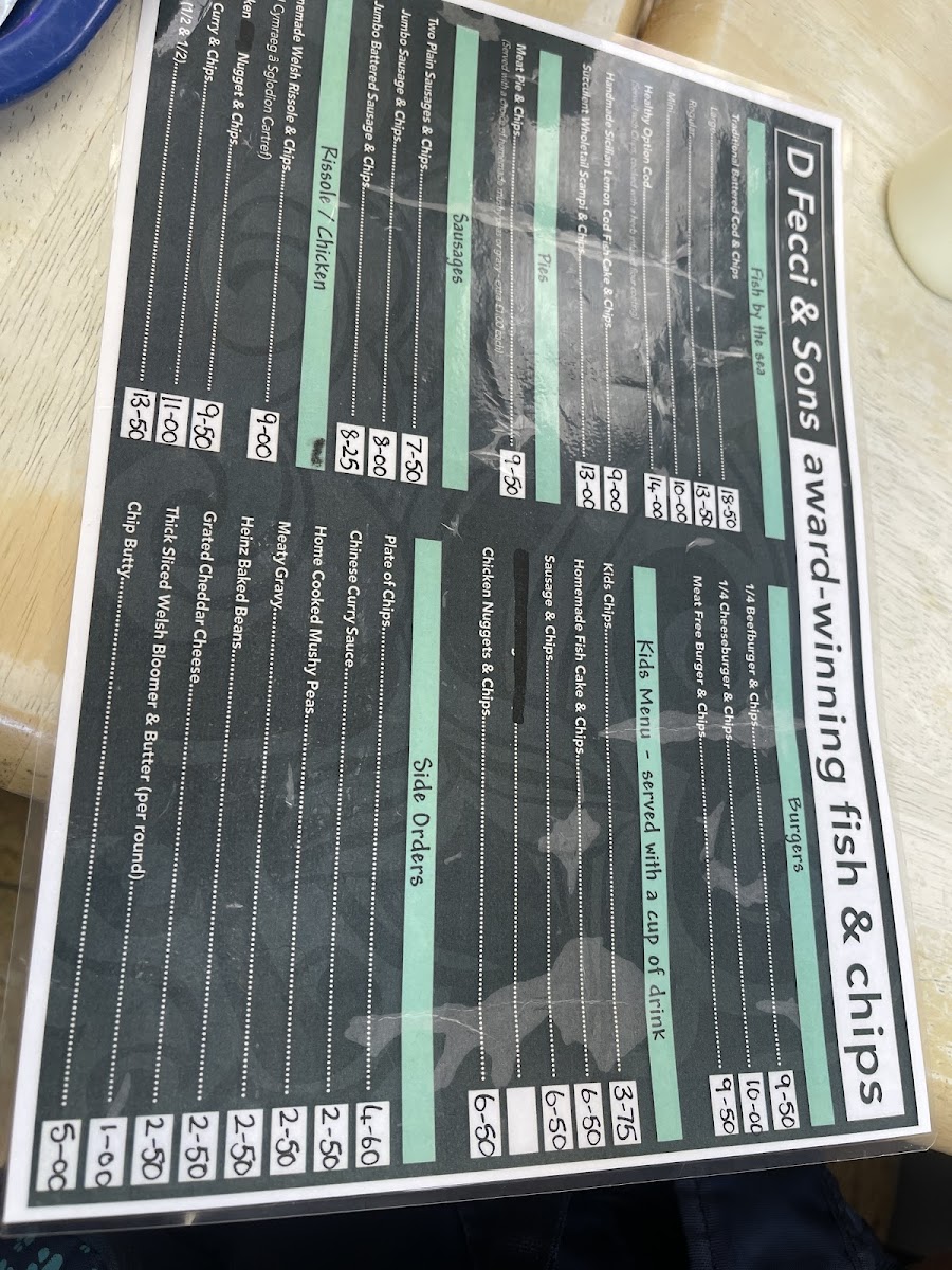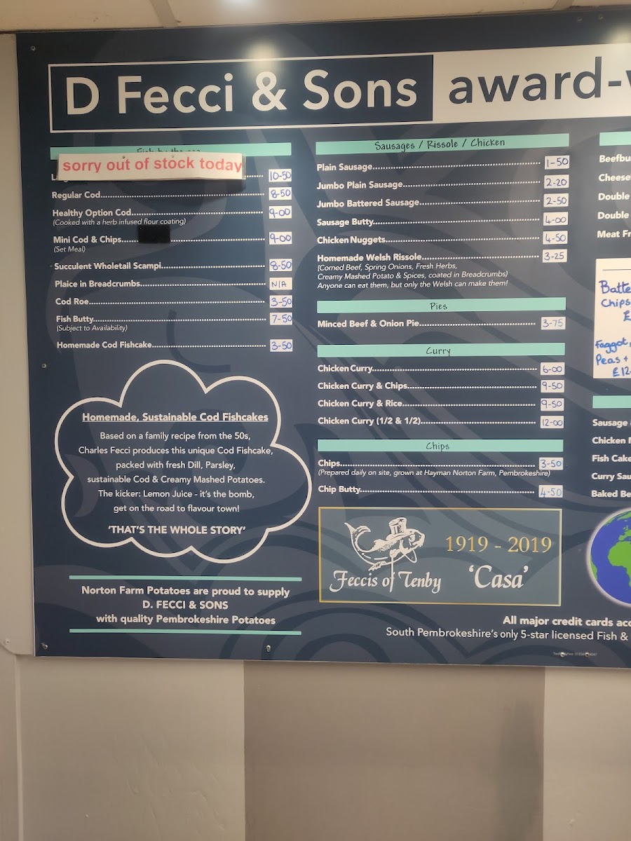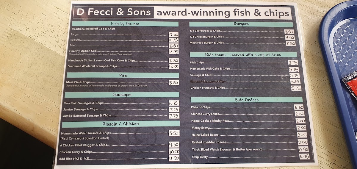 At D. Fecci and Sons, located on Lower Frog St in the charming seaside town of Tenby, we invite you to embark on a delicious journey through our specially curated menu. Renowned for our irresistible Fish and Chips, both regular and large portions, along with our delightfully crispy Fish Cakes served with golden chips, our offerings are designed to tantalize your taste buds. Indulge in our signature Battered Sausage and Chips or try the unique Deep Fried Crème Egg for a sweet twist. We cater to every palate, with options including gluten-free chips and curry sauce, and even Coeliac-friendly Fish N Chips. Whether you fancy a classic Haddock and Chips or the comforting warmth of Fish Chips and Mushy Peas, every dish is crafted with care and passion. Don’t forget to pair your meal with a smooth Latte and indulge in some delicious Nuggets Con Patatas. Come experience the heart of Tenby's culinary scene at D. Fecci and Sons,your taste buds will thank you!