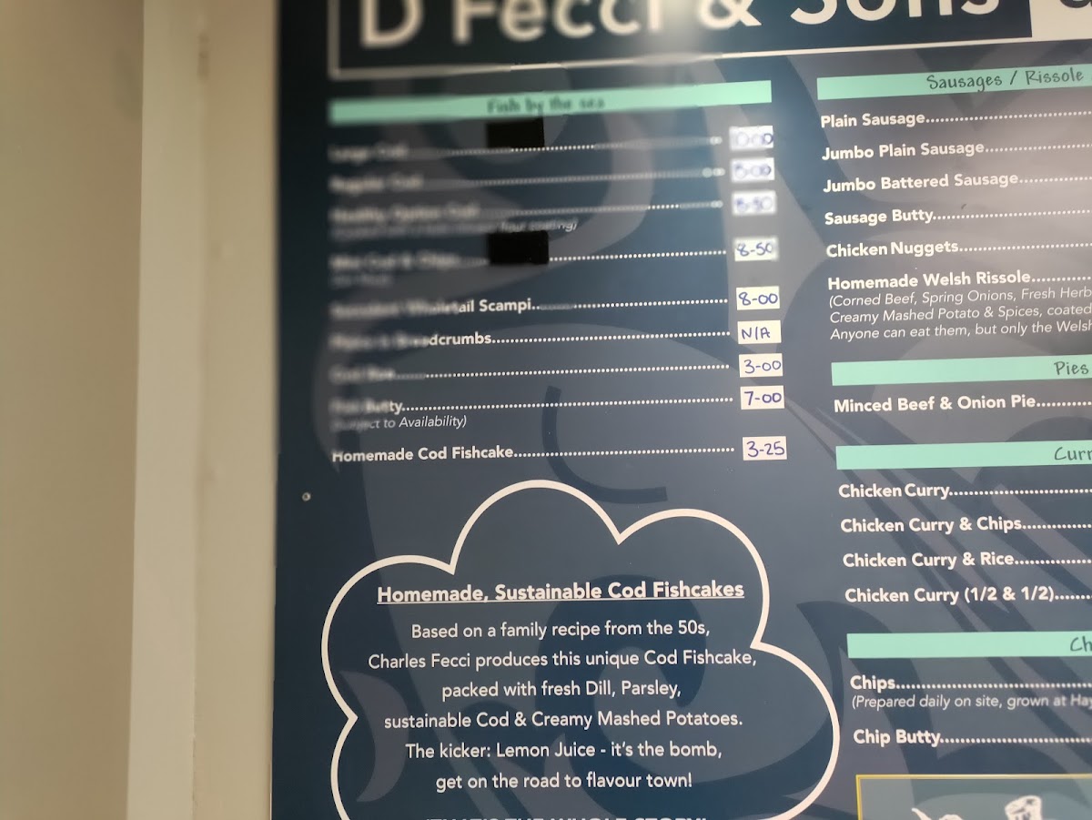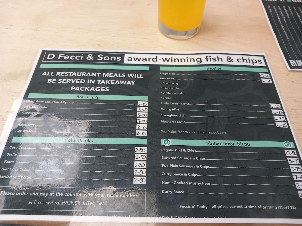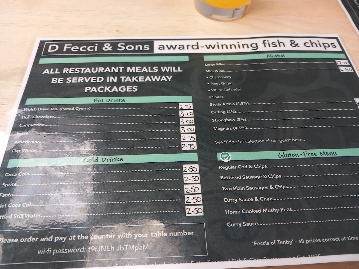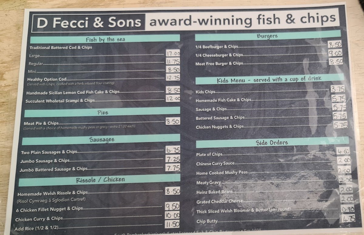 At D. Fecci and Sons, located on Lower Frog St in the charming seaside town of Tenby, we invite you to embark on a delicious journey through our specially curated menu. Renowned for our irresistible Fish and Chips, both regular and large portions, along with our delightfully crispy Fish Cakes served with golden chips, our offerings are designed to tantalize your taste buds. Indulge in our signature Battered Sausage and Chips or try the unique Deep Fried Crème Egg for a sweet twist. We cater to every palate, with options including gluten-free chips and curry sauce, and even Coeliac-friendly Fish N Chips. Whether you fancy a classic Haddock and Chips or the comforting warmth of Fish Chips and Mushy Peas, every dish is crafted with care and passion. Don’t forget to pair your meal with a smooth Latte and indulge in some delicious Nuggets Con Patatas. Come experience the heart of Tenby's culinary scene at D. Fecci and Sons,your taste buds will thank you!